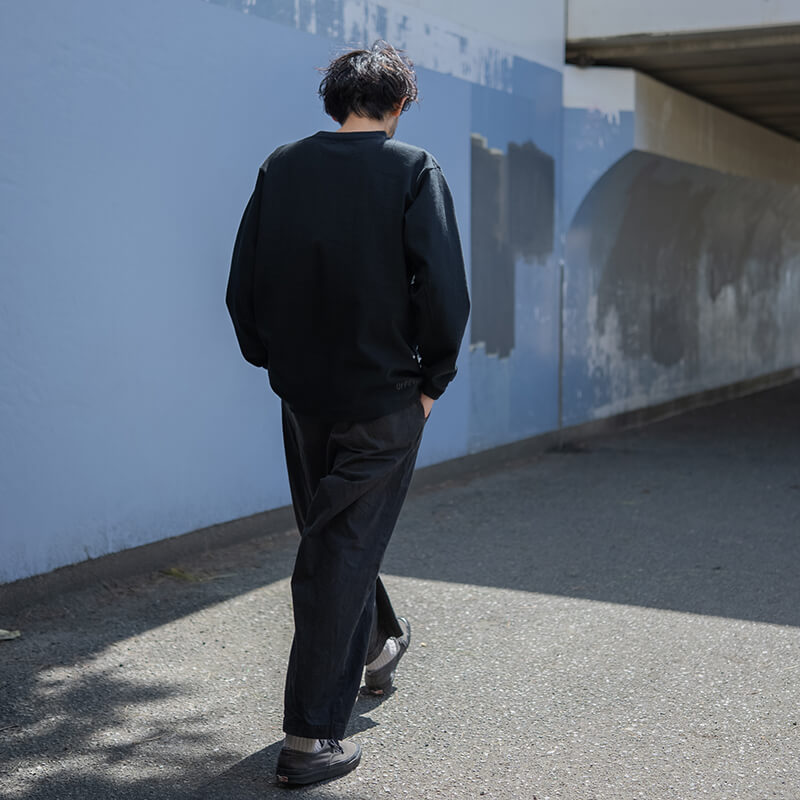 インナーとしてのロンTではなく、1枚で「アウター」として成立するゆったりとしたシルエットに設計。ドロップショルダーと広めの身幅が、大人の余裕を感じさせるリラックスした空気感を演出します。
