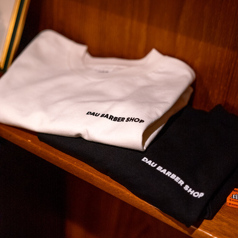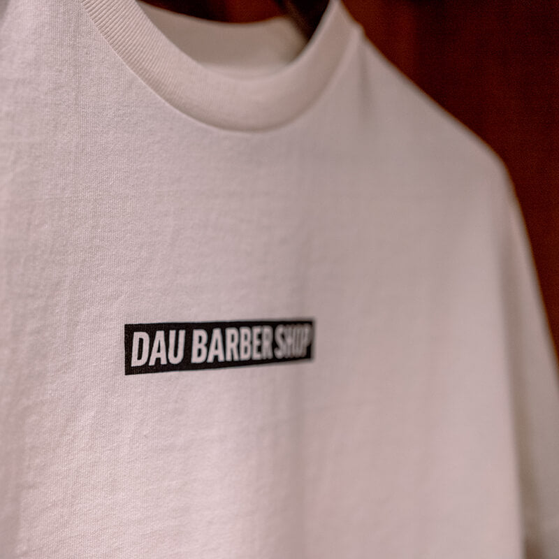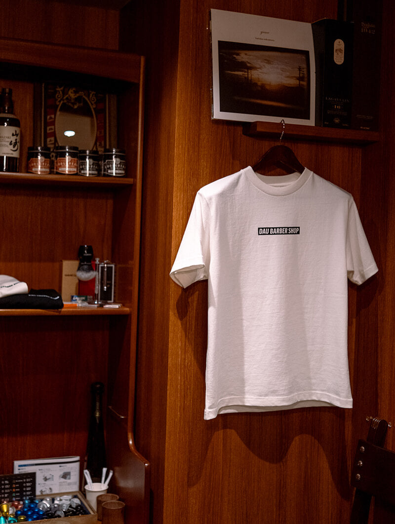 青山を中心に展開しているDAU BARBER SHOPとのコラボレーションTシャツ。店舗に合わせてデザインを作成し、シルクスクリーンでプリント。店舗にて販売中です。
