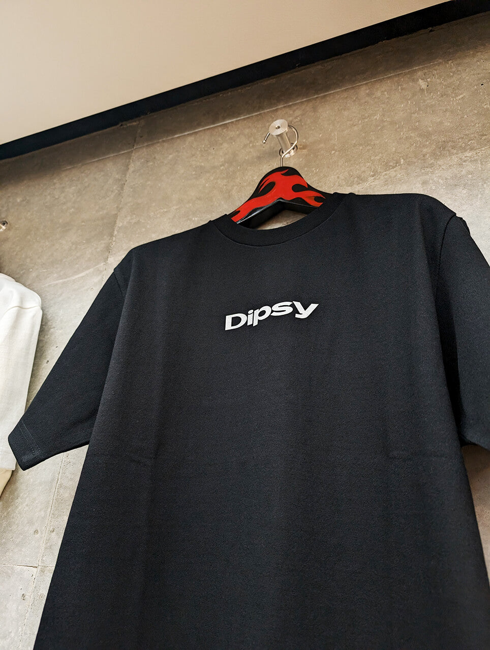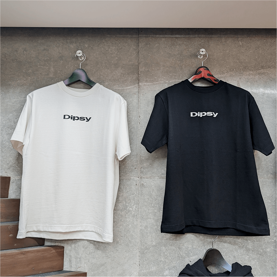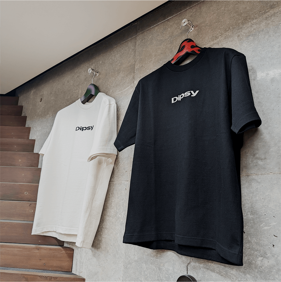次世代ソーシャルライブストリーミングアプリDipsyとのコラボレーションTシャツ。Standard Tシャツ - WHITEとBLACKのボディにDipsyのロゴをシルクスクリーンでプリント。非売品。